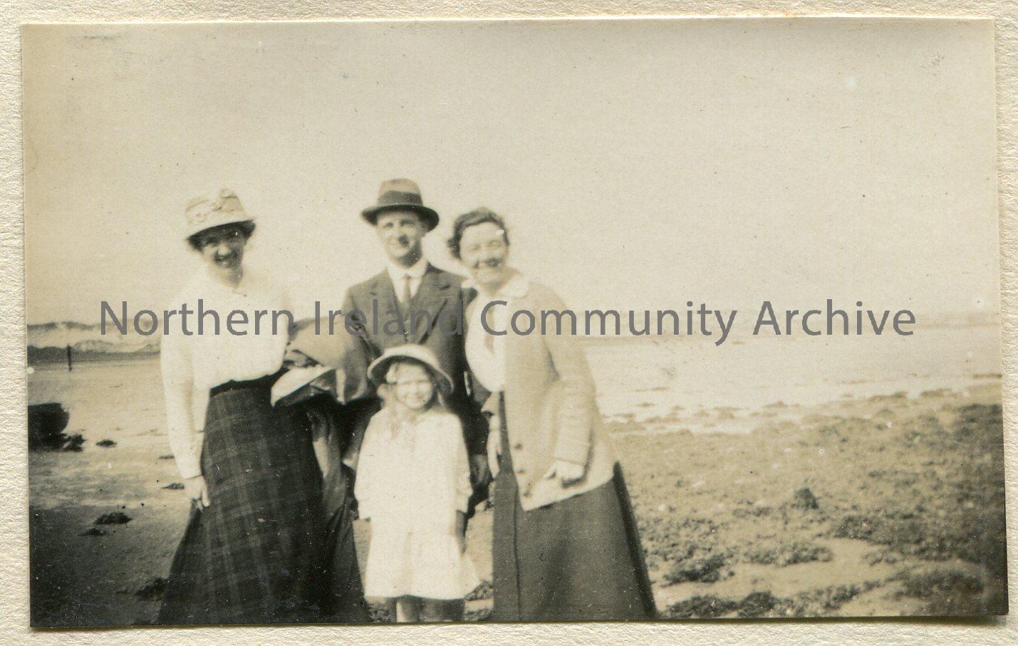 Small black and white photograph on a beach of Maimie Henry nee Liken (left), John Simpson (centre of Simpson & Hill according to JM. See CM:2015:929.546), another woman and child (possibly John Simpson's wife and daughter?).