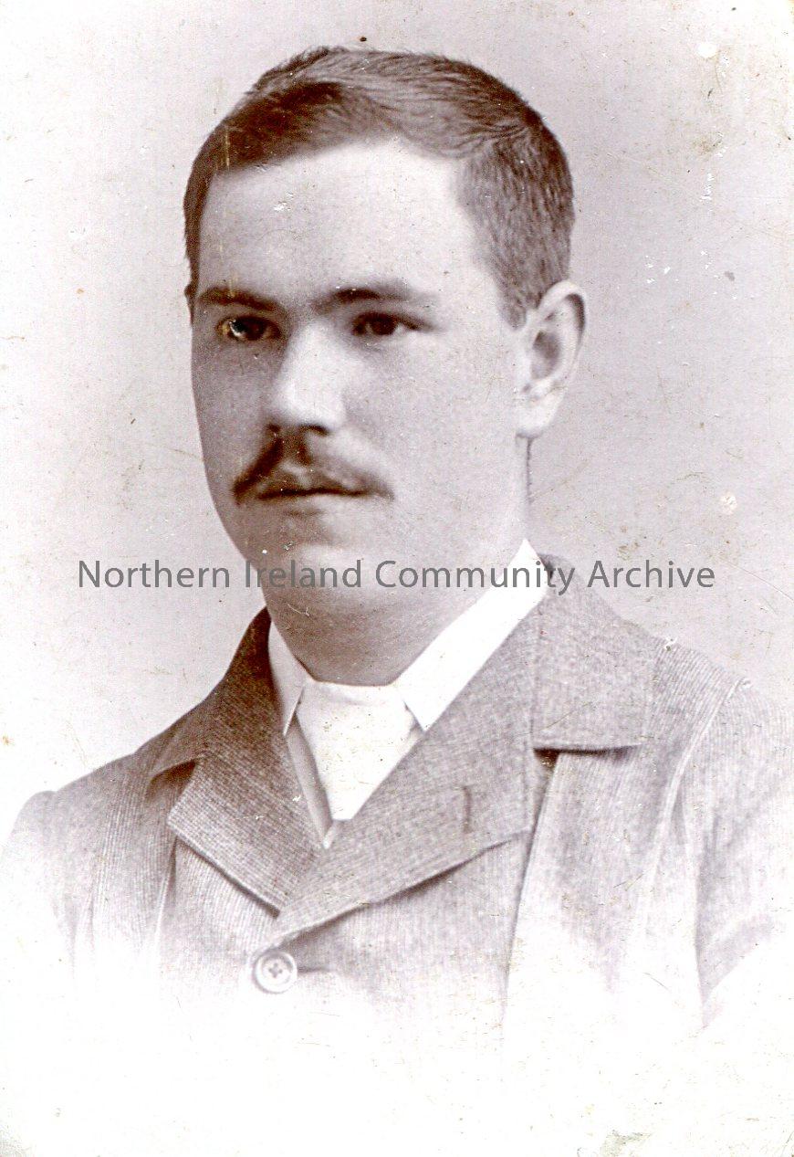 Small, black and white portrait photograph captioned ‘Sam Henry, Coleraine’. Sam as a young man.