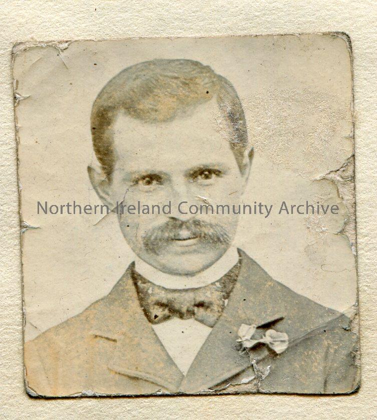 Small, black and white portrait photograph of a man with a large moustache wearing a bow tie.