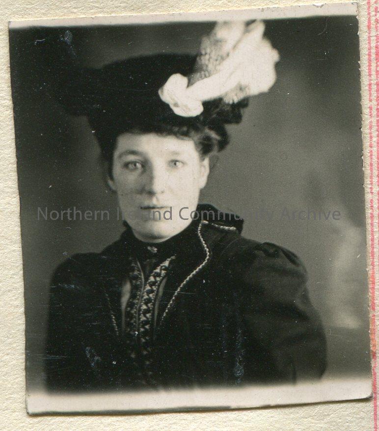 Small, black and white portrait photograph of a woman and she is wearing a hat with feathers coming out at one side.