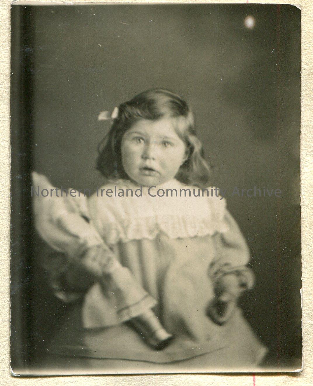 Small, black and white portrait photograph of a young girl. Possibly aged 2-3 years. She is holding a dolly in her right arm.