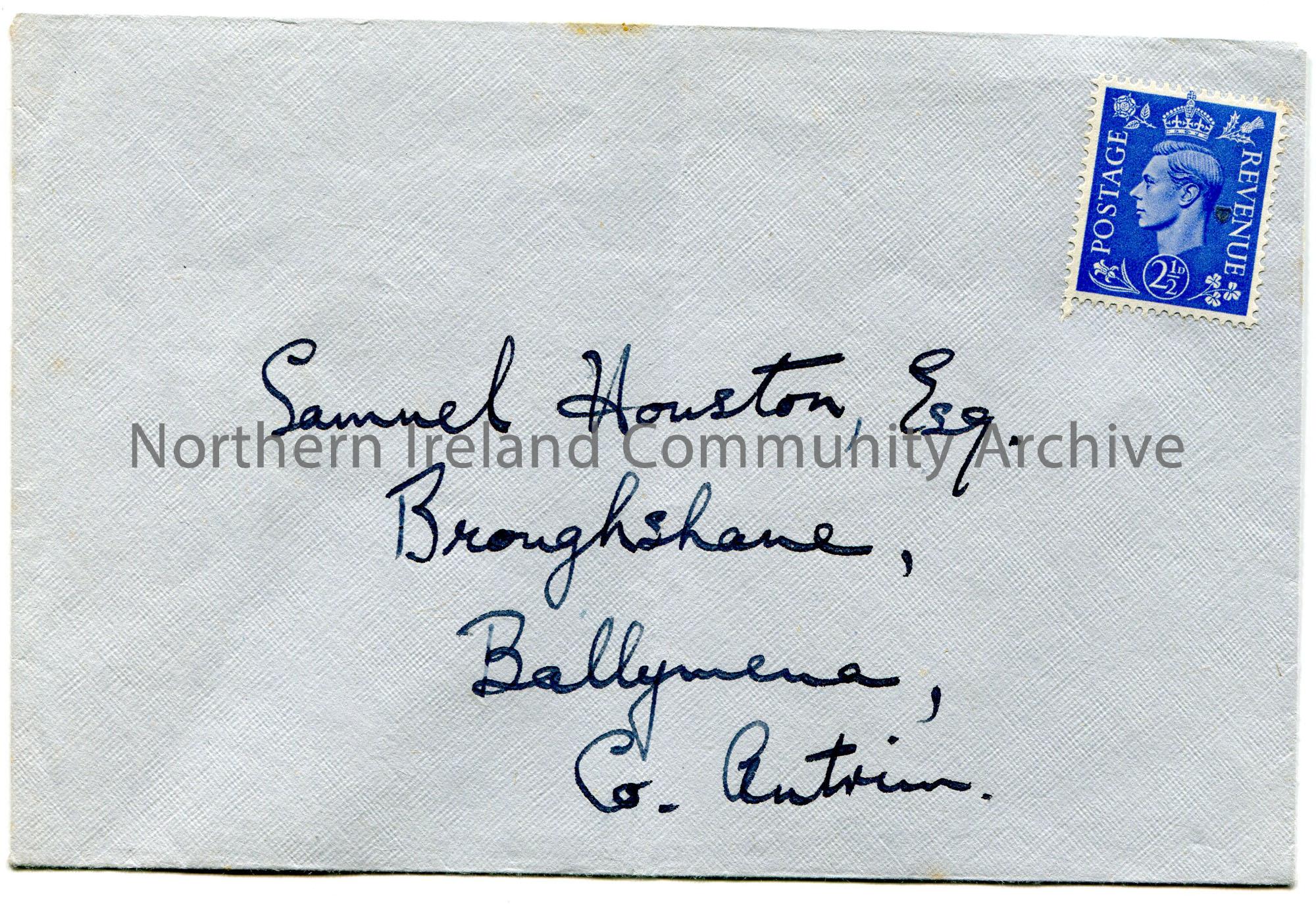 Small blue envelope with handwritten address to Samuel Houston, Esq., Broughshane, Ballymena, Co. Antrim. Blue 2 1/2d King George VI postage stamp stuck to top right corner. Envelope does not appear to have been sent/used.