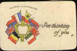 Small card found inside embroidered postcard - flags of UK and allies, 'I'm thinking of you'.