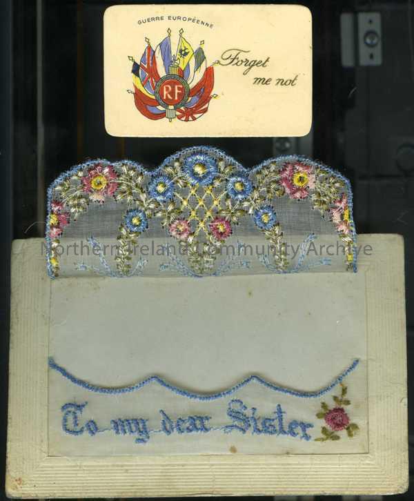 Small card from inside embroidered postcard, flags of UK and allies and ‘Forget me not’