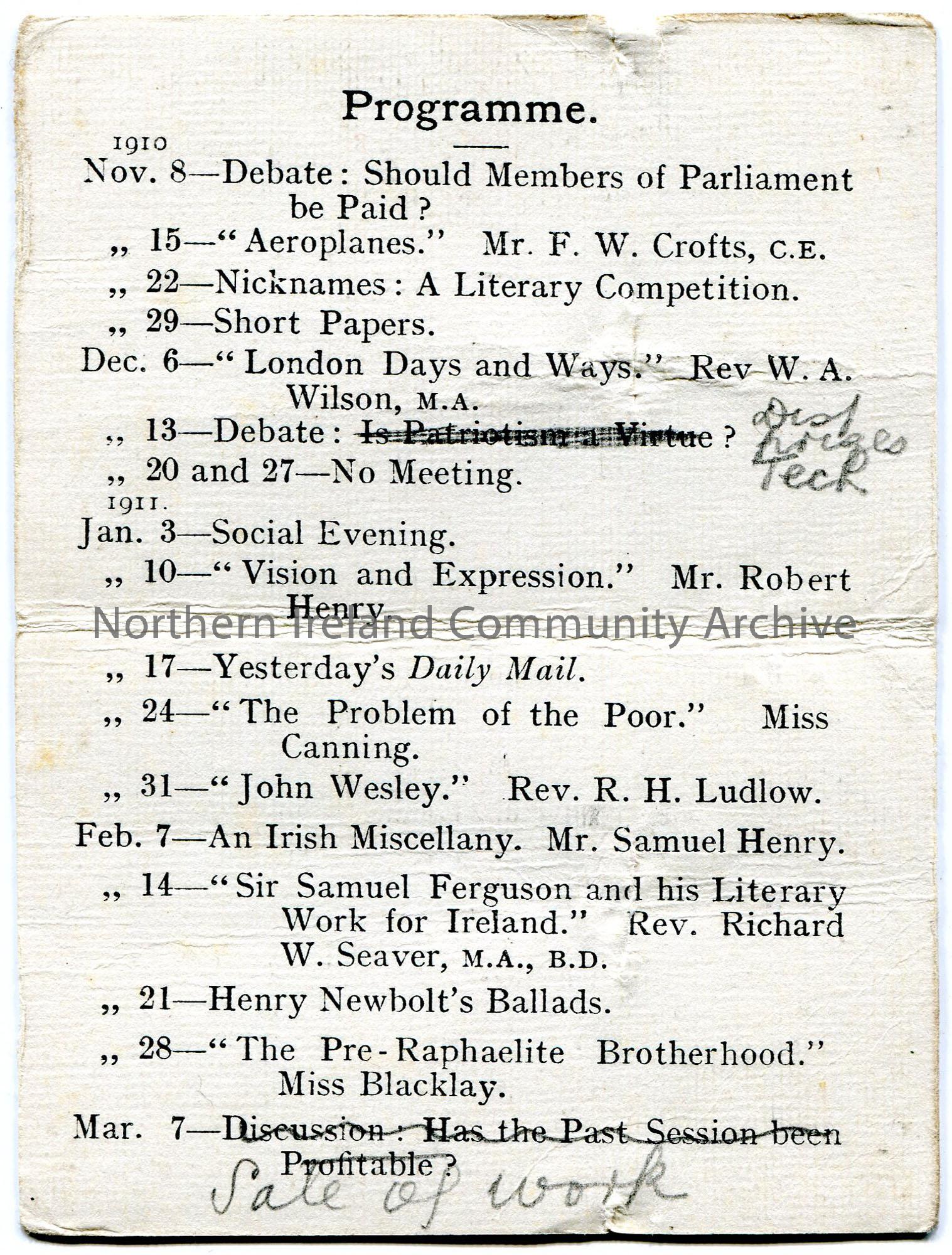 Small card which folds in half – 1910 – 1911 Programme of events for New Row Association, Coleraine. Meetings in New Row Lecture Hall on Tuesday eveni… – scan105b