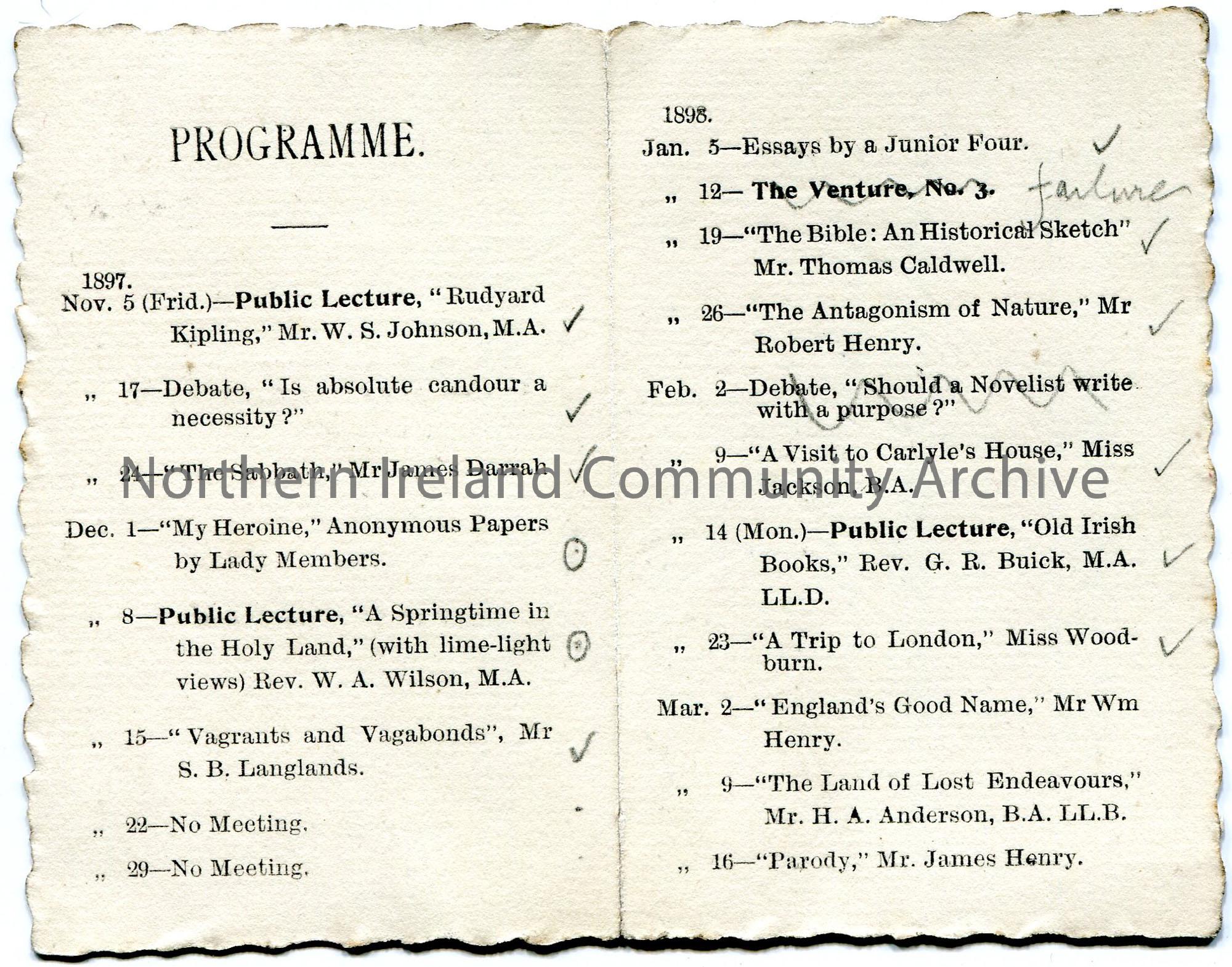 Small card which folds in half with gilded gold edging. 1897 - 1898 Programme of events for New Row Association, Coleraine. Meetings in New Row Lecture Room on Wednesday evenings at 8 o'clock. President Mr George Wilson, Vice President Mr Thomas Caldwell and Secretary Mr James Henry. Miss Liken and Mr Wm [William] Henry listed as committee members.