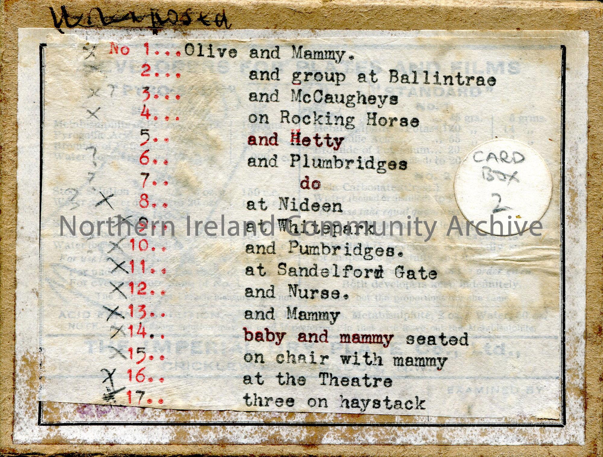 Small, cardboard box labelled with a list of seventeen slide names. ‘x’ marked in pencil against numbers. Originally contained glass slides. ‘ S HENRY…