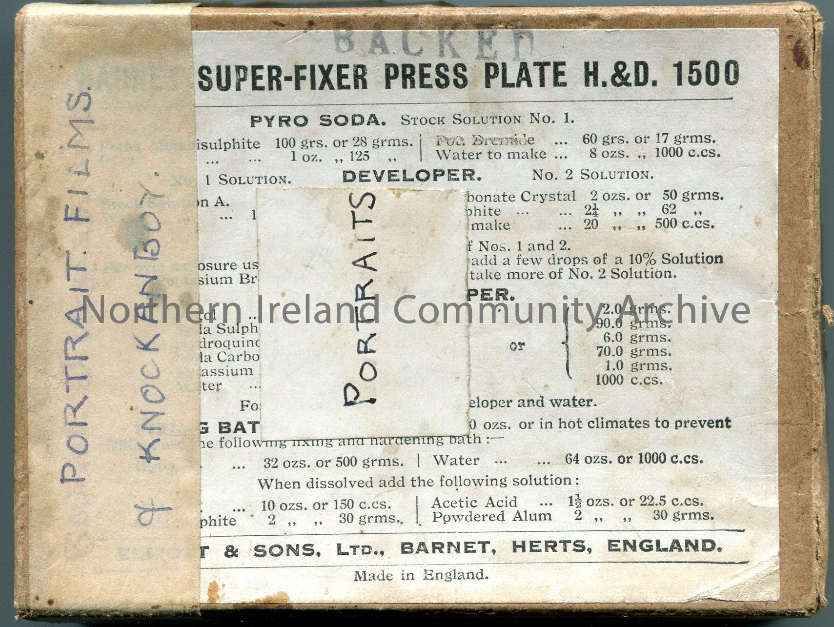 Small, cardboard box with lid [not attached] labelled 'Harnet Super-Fixer Press Plate H.&D. 1500'. List of solutions for developer of film ? Made by 'Elliott & Sons, Ltd., Barnet, Herts, England'. Also labelled in handwriting 'Portrait Films & Knockanboy' and 'Portraits'.