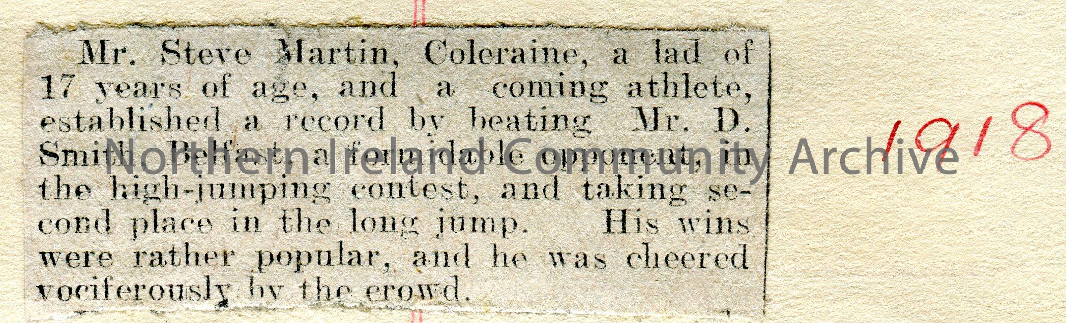 Small cutting from a newspaper re sports news. Mentions the victory of Mr Steve Martin, Coleraine over Mr D. Smith, Belfast in the high-jump. Dated 1918.