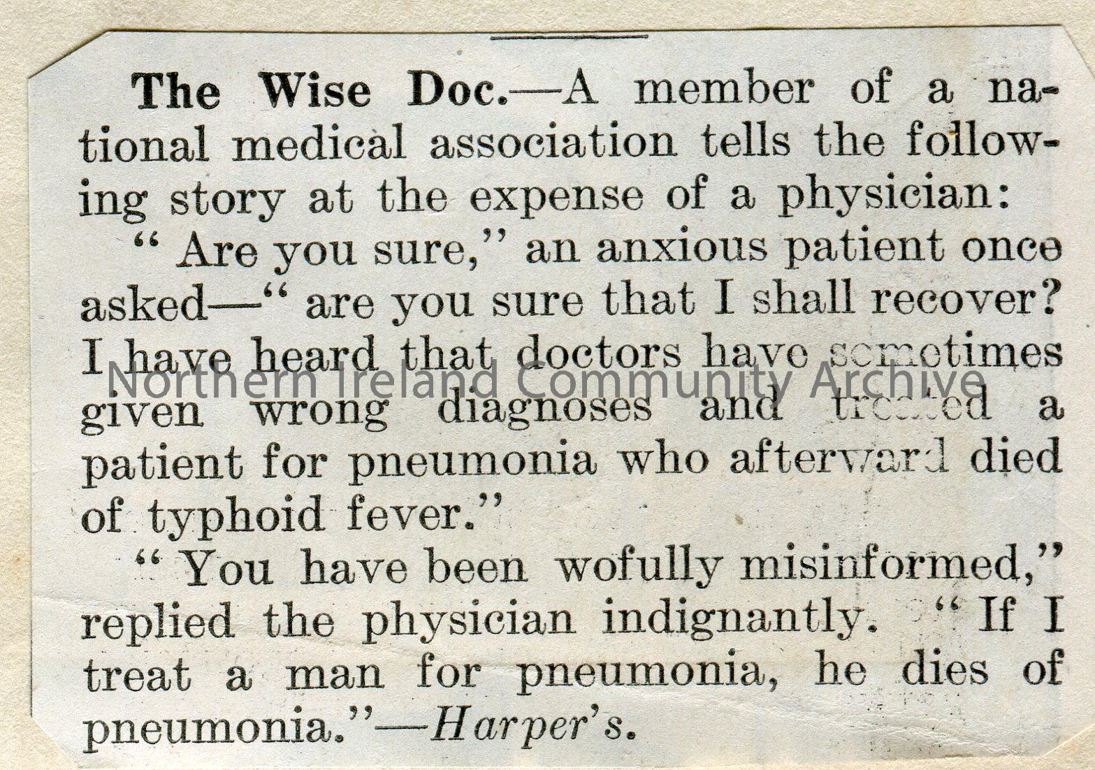 Small cutting from a publication of a short humorous story titled, ‘The Wise Doc’. Taken from ‘Harper’s’.