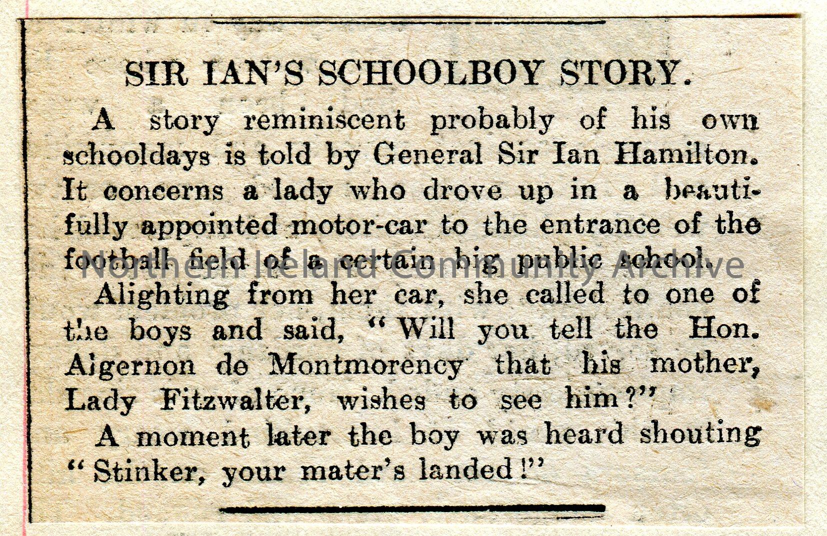 Small cutting of a short story of a few lines from a newspaper. Titled, ‘Sir Ian’s Schoolboy Story’.