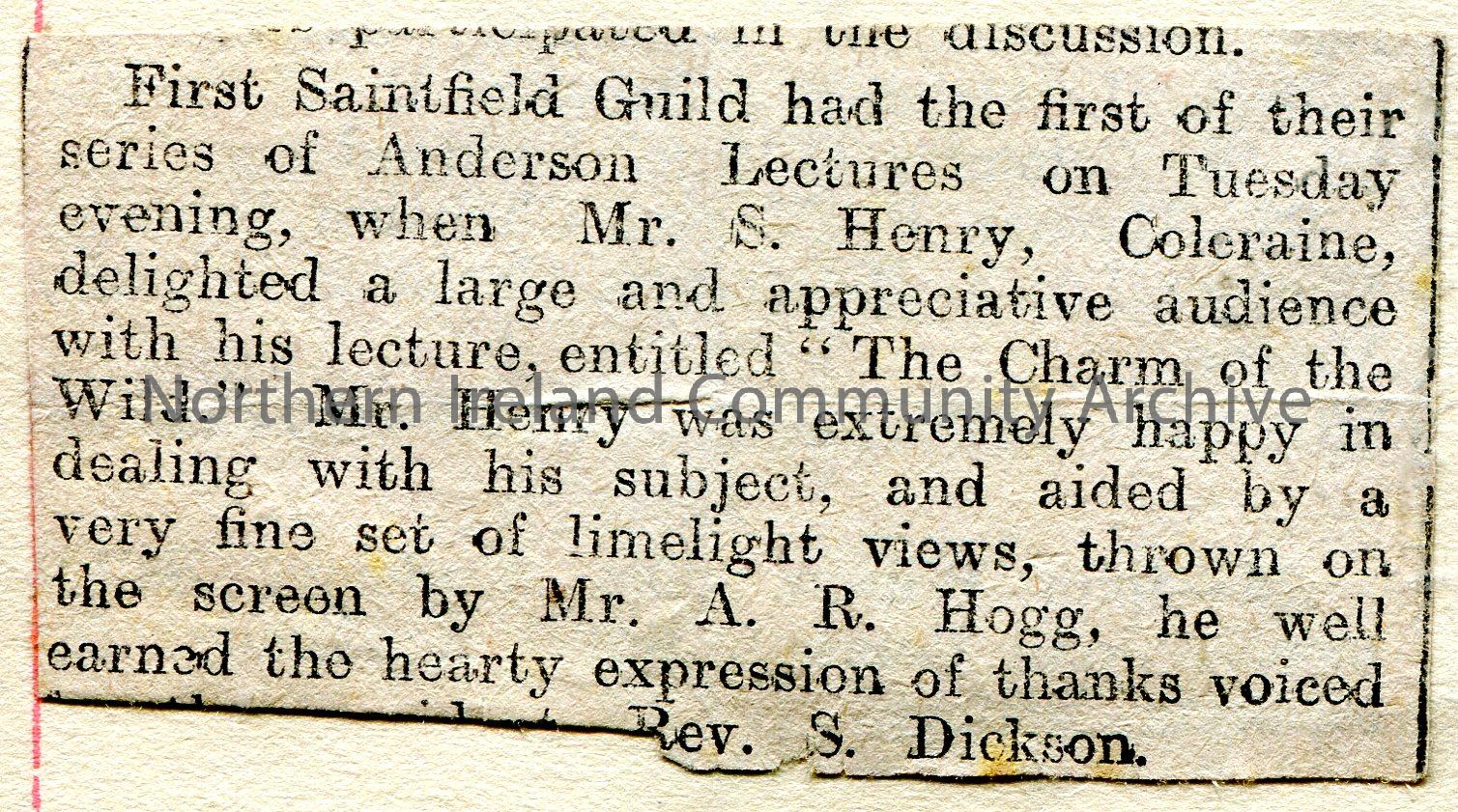 Small cutting of an article from a newspaper. Reporting a lecture by Sam Henry titled, 'The Charm of the Wild' at First Saintfield Guild as the first in a series of Anderson Lectures. Also mentions Mr A R Hogg and Rev S Dickson.