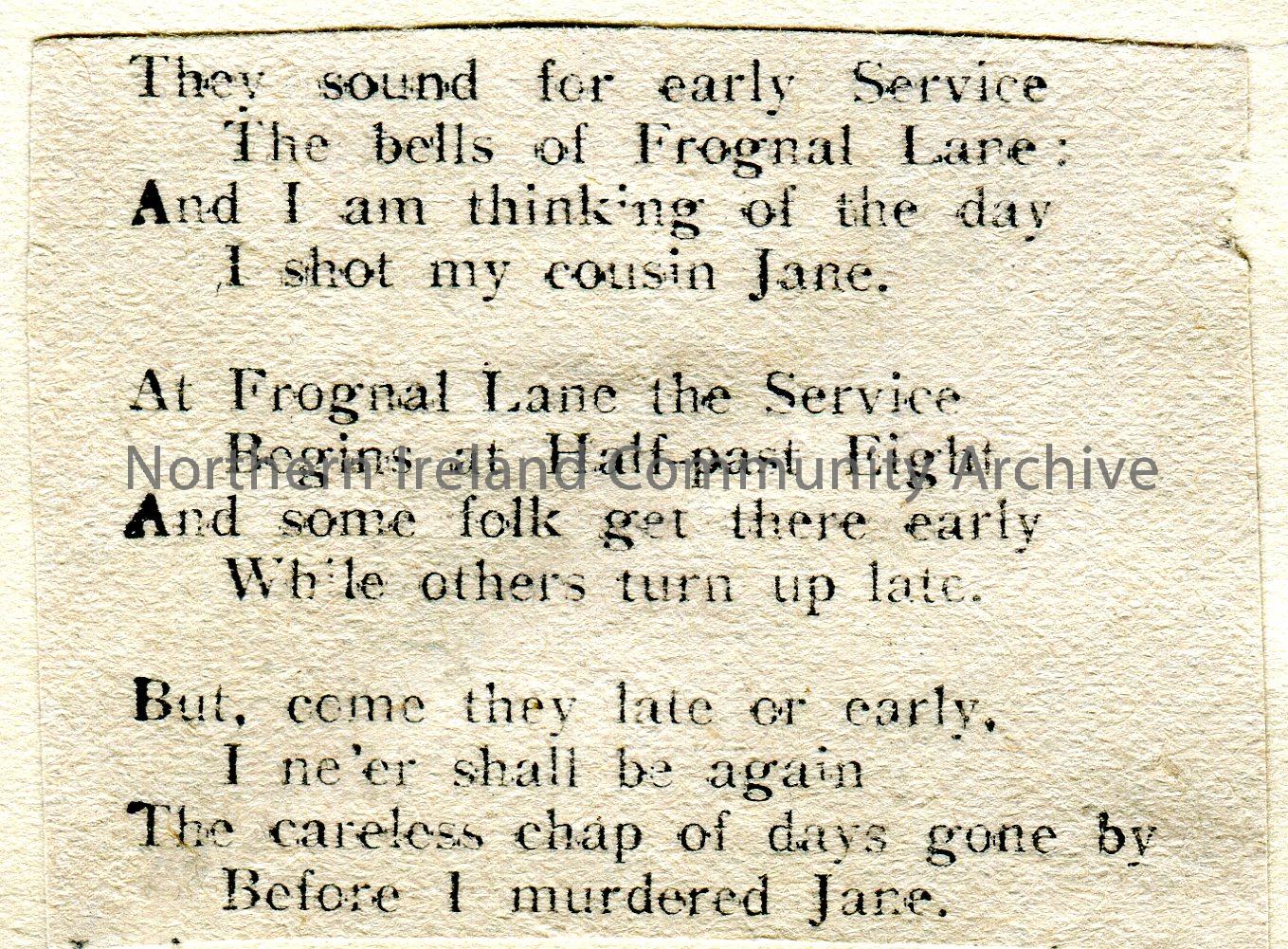 Small cutting of three verses of a poem – ‘The Bells of Frognal Lane’.