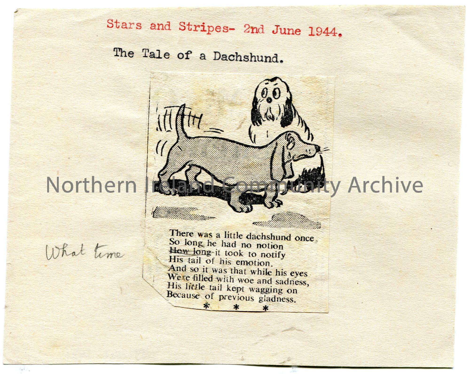Small cutting stuck to page from newspaper 'Stars and Stripes' of a verse titled, 'The Tale of a Dachshund'. Image of two dogs, one of which is a Dachshund. Dated 2nd June, 1944.