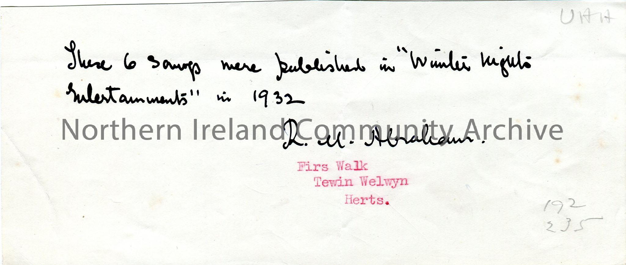 Small handwritten note re unnamed song publication, signed by R U Abraham