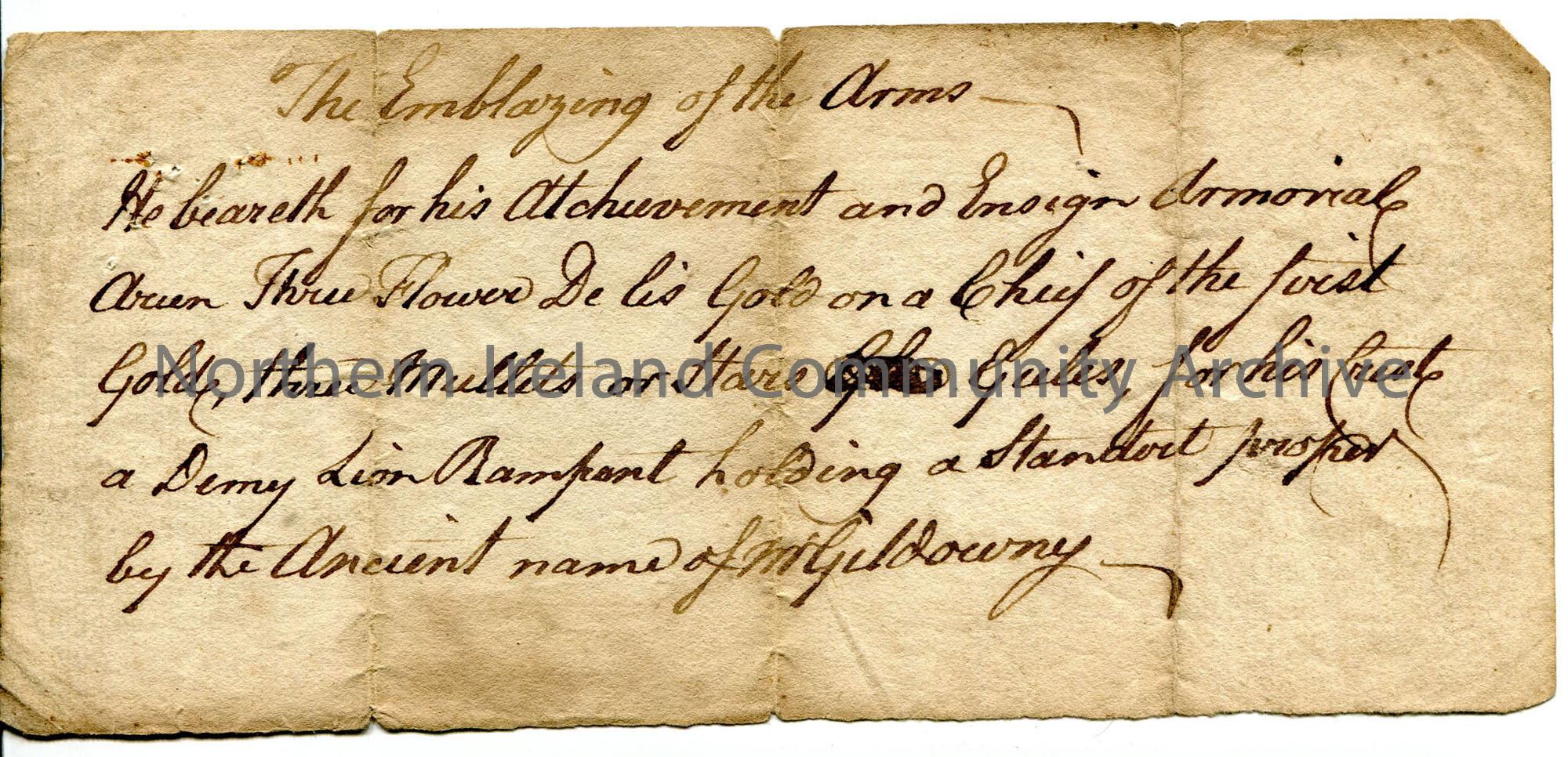 Small handwritten paragraph describing McGildowny coat of arms, under heading ‘The Emblazing of the Arms’. No date but handwriting appears of antiquit…