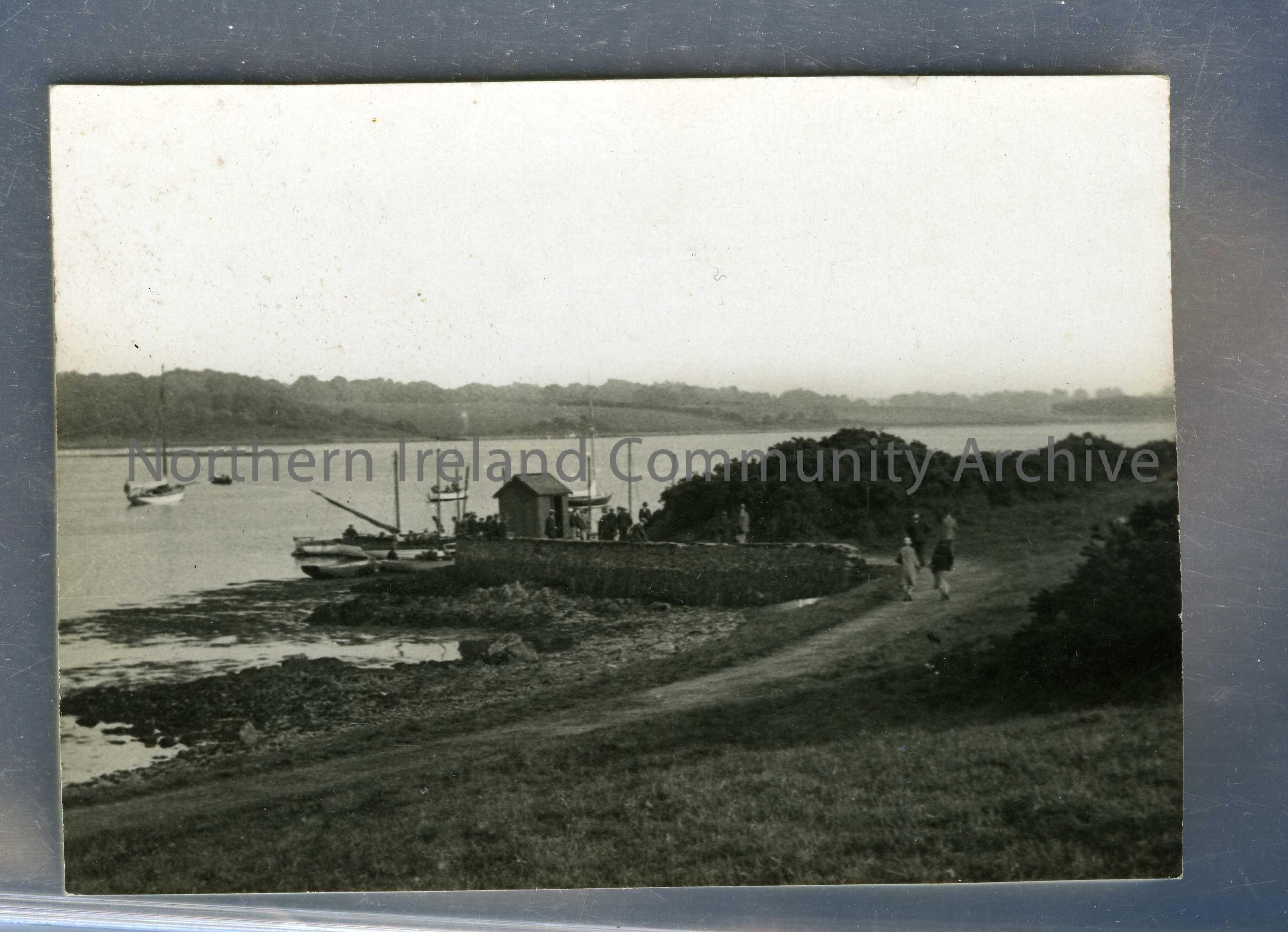 Small harbour and boathouse. Various boats are in the water.