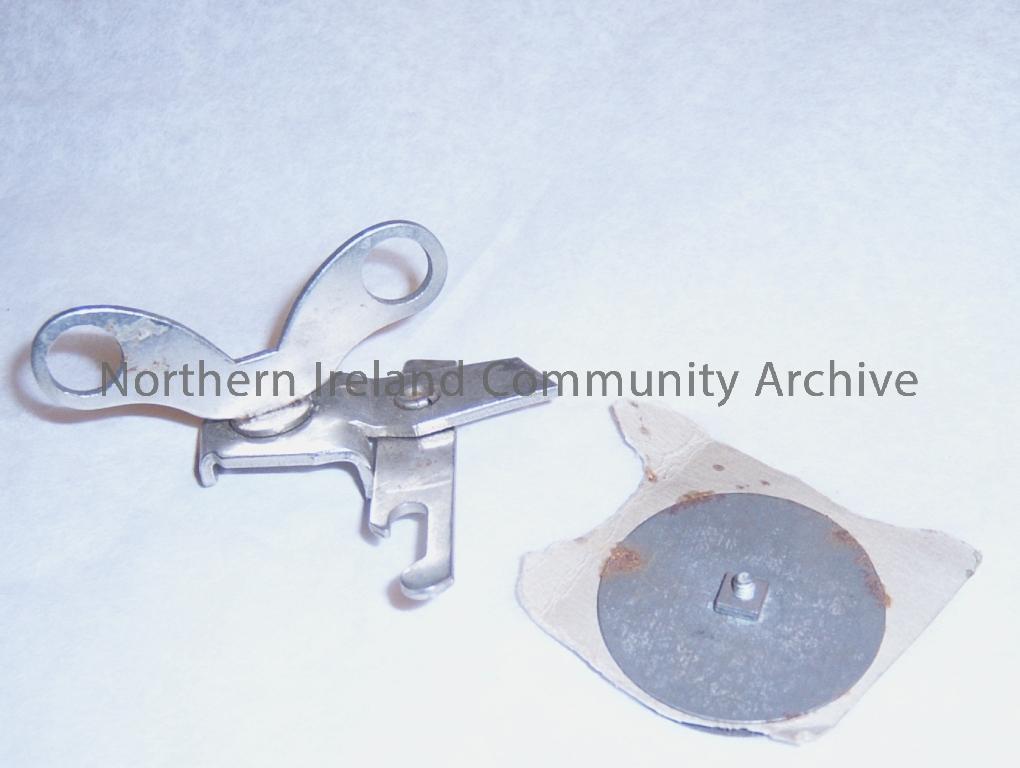 small metal can opener with circular metal disc, perhaps once part of it (from the donors mothers 1950s kitchen) (1695)