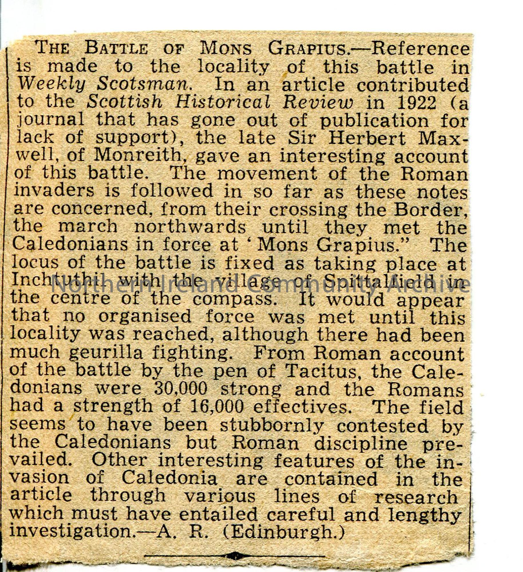 Small newspaper cutting about site of Battle of Mons Grapius – Caledonians against Romans (led by Galgacus)