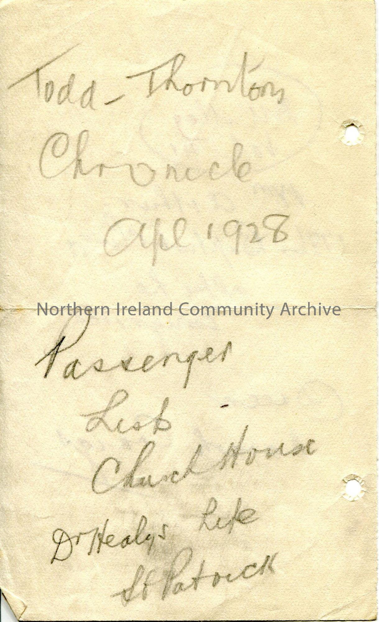 Small page of handwritten rough notes re Arthurs and passenger lists - no context or detail
