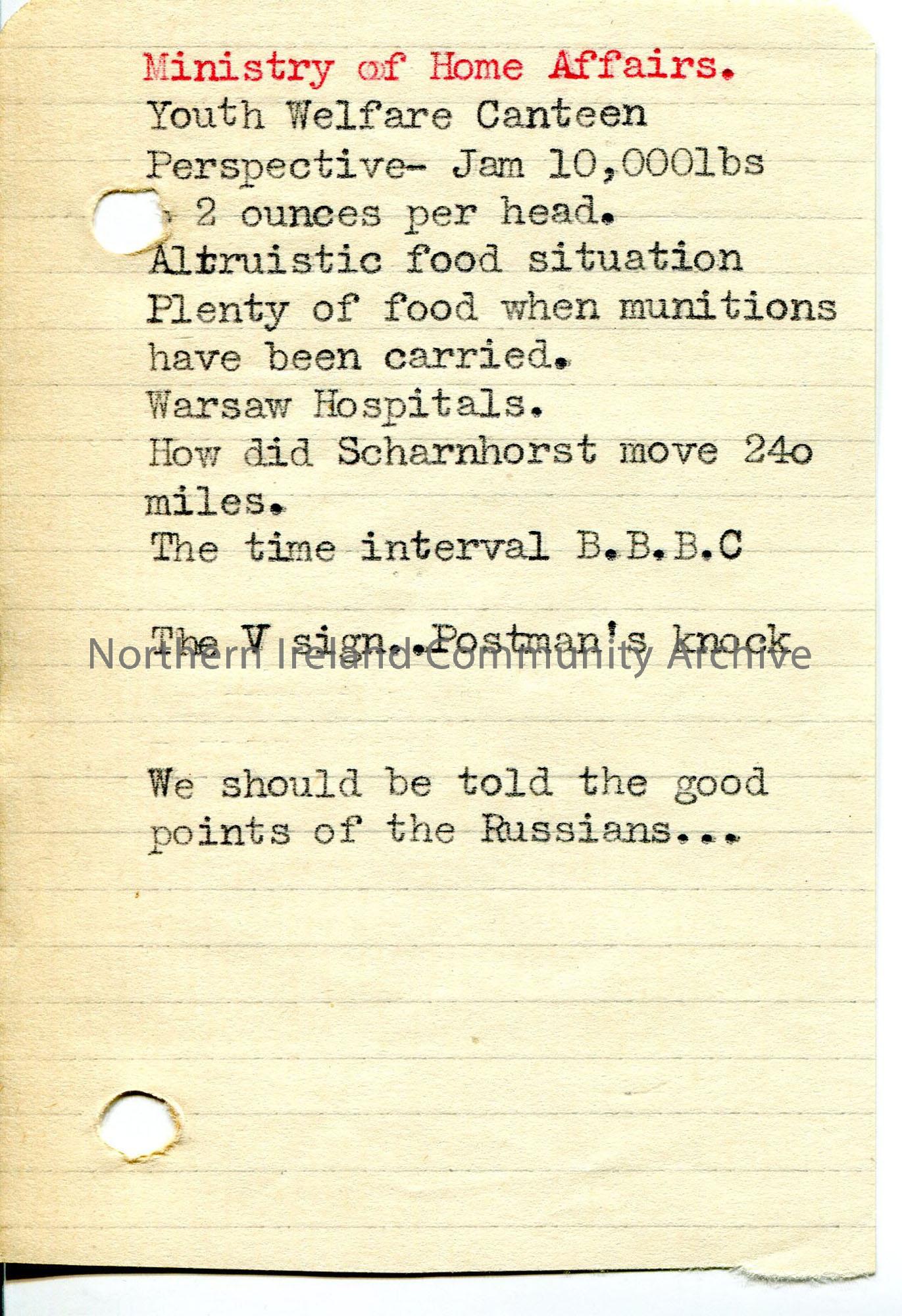 Small page of typed notes, brief and unconnected, under heading ‘Ministry of Home Affairs’, several in relation to food.