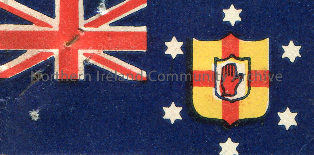 Small, paper flag of Northern Ireland. Union Jack is in the top corner. It also features the Coat of Arms which is surrounded by 6 stars. The same ima…