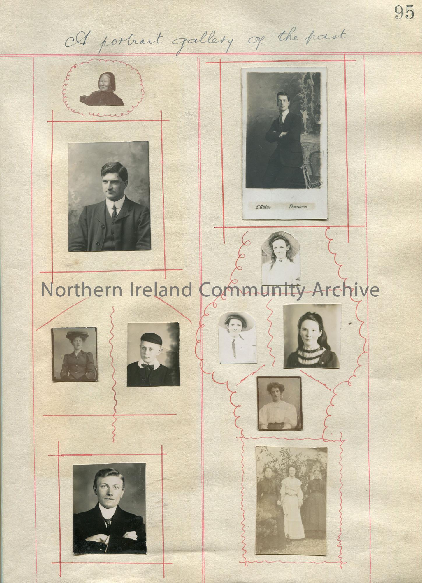 Small part cut from a photograph of an older woman. Part of several photographs pasted to page titled, 'A portrait gallery of the past'.