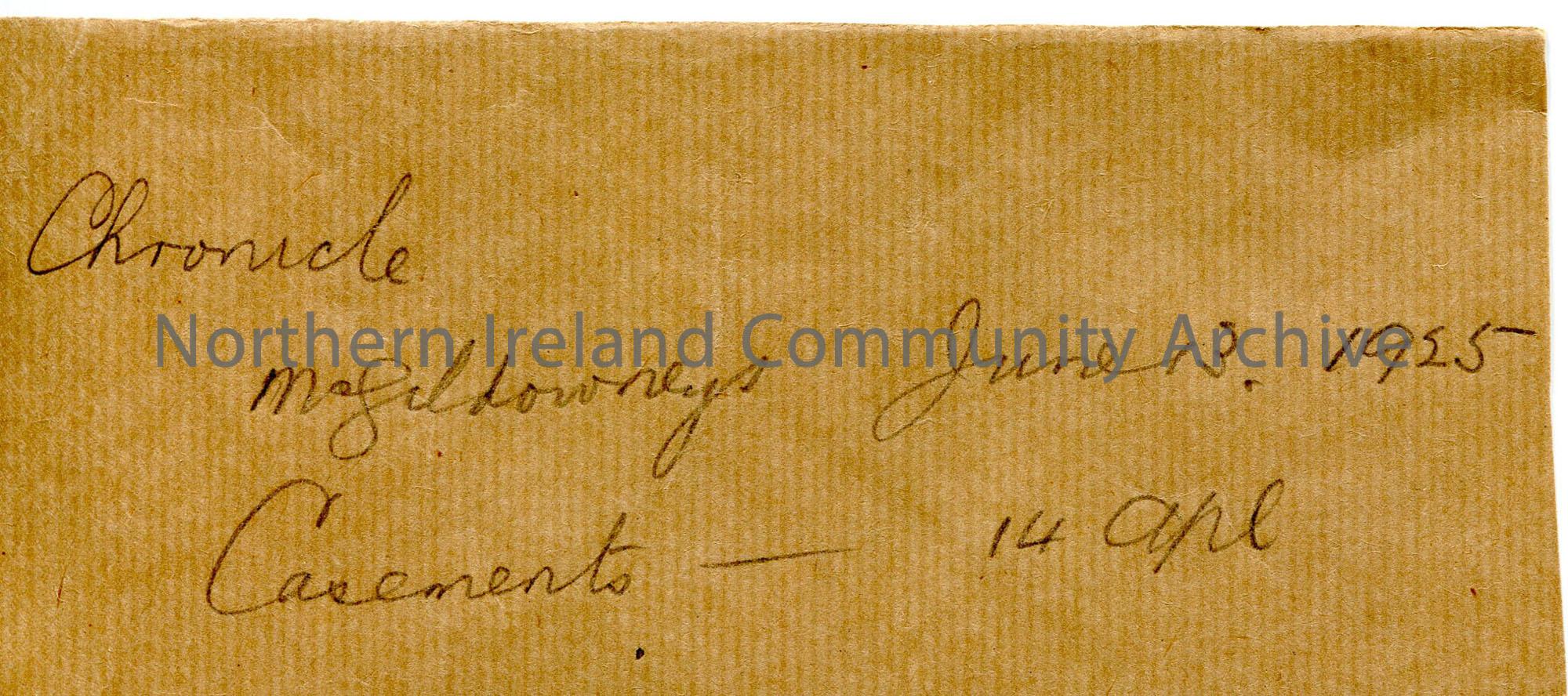 Small piece of brown parcel paper with dates re McGildowneys and Casements in Chronicle