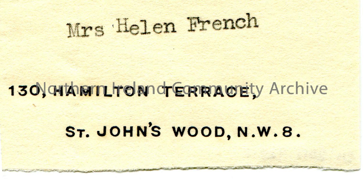 Small piece of paper cut from a letter head with the address ‘130 Hamilton Terrace, St. John’s Wood, N W 8’ printed and the name ‘Mrs Helen French’ ty…