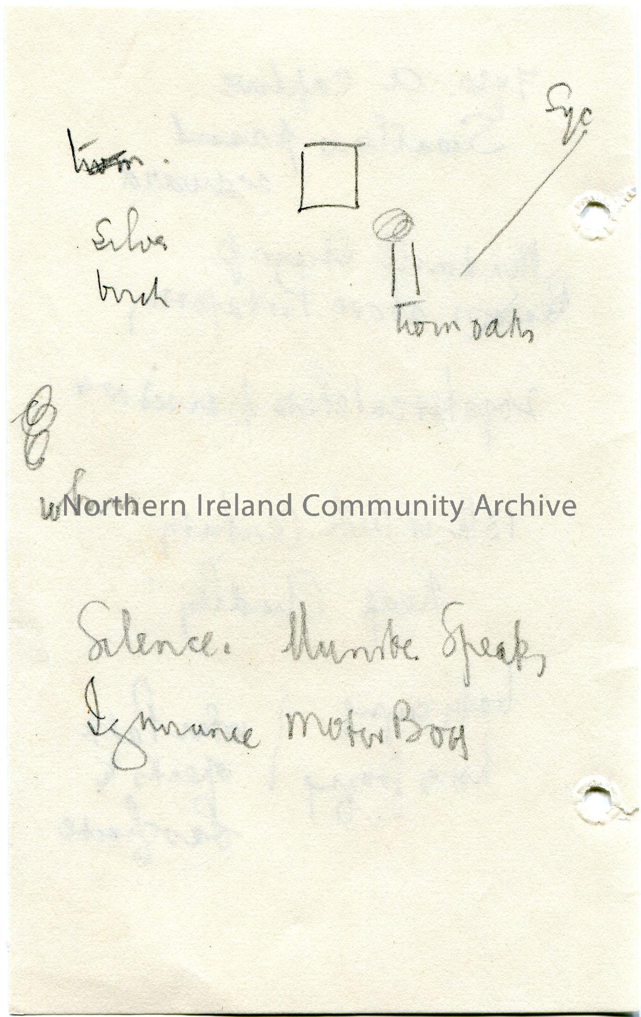 Small piece of paper with handwritten rough notes in pencil, not in context. Mentions birds, Portaferry, small diagram on reverse re trees. – scan088b