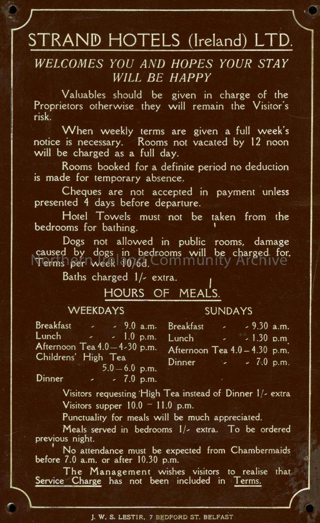Small plaque from the Strand Hotels (Ireland) LTD. Lists conditions for staying in the hotel regarding payment, hotel towels, dogs, chambermaids hours, meal times and advice on storing valuables.