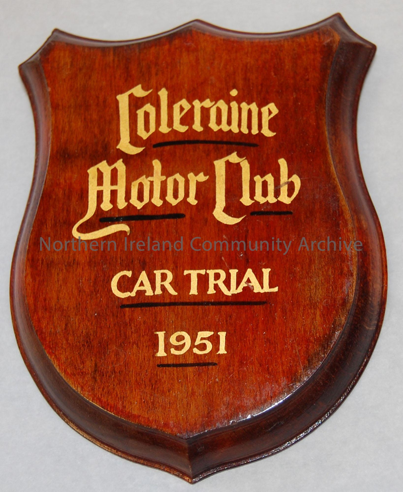 Small plaque with wooden mount and metal hoop at back.Coleraine Motor Club Car Trial 1951