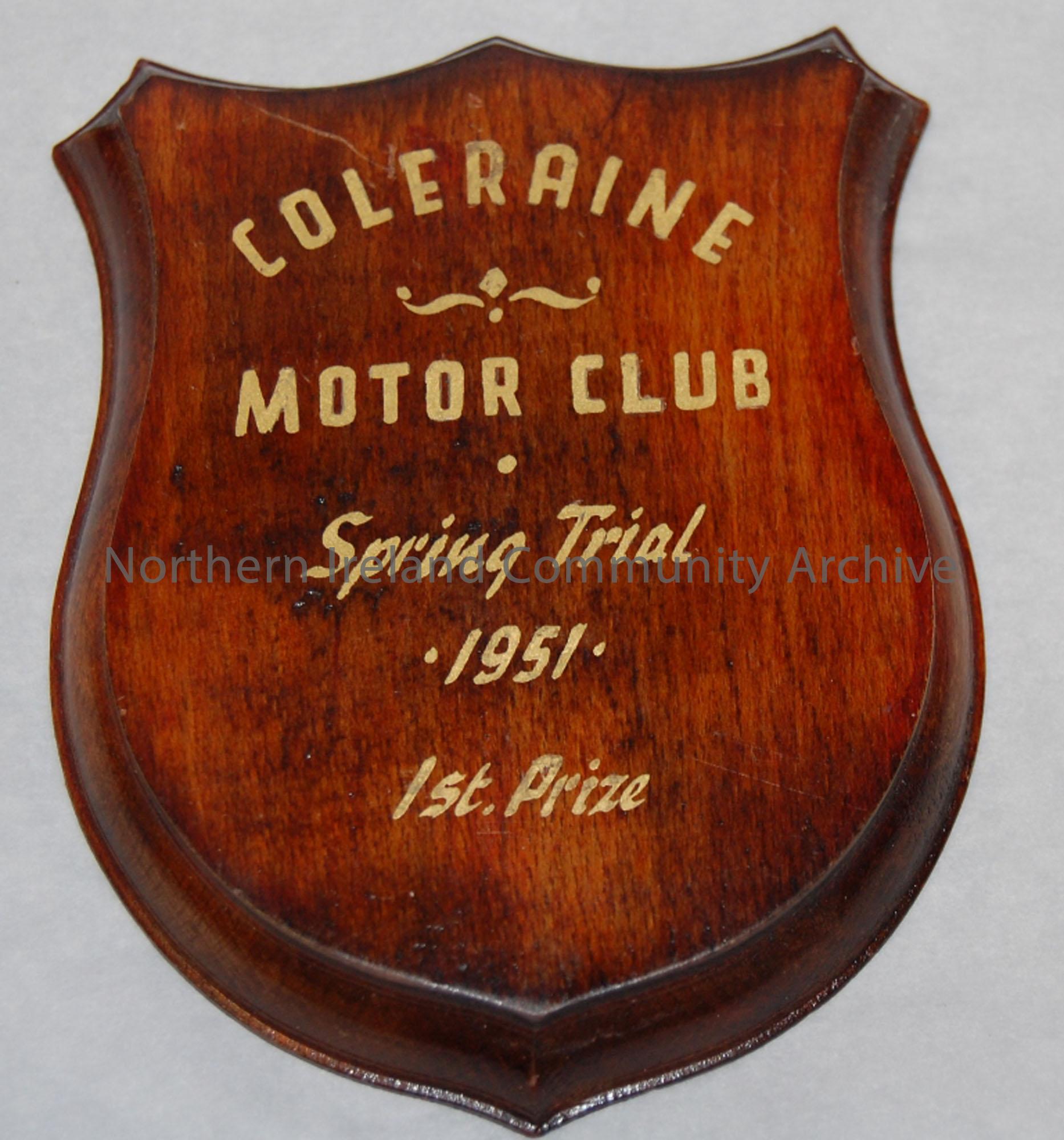 Small plaque with wooden mount. Coleraine Motor Club Spring Trial 1951 1st prize. No stand attached to back