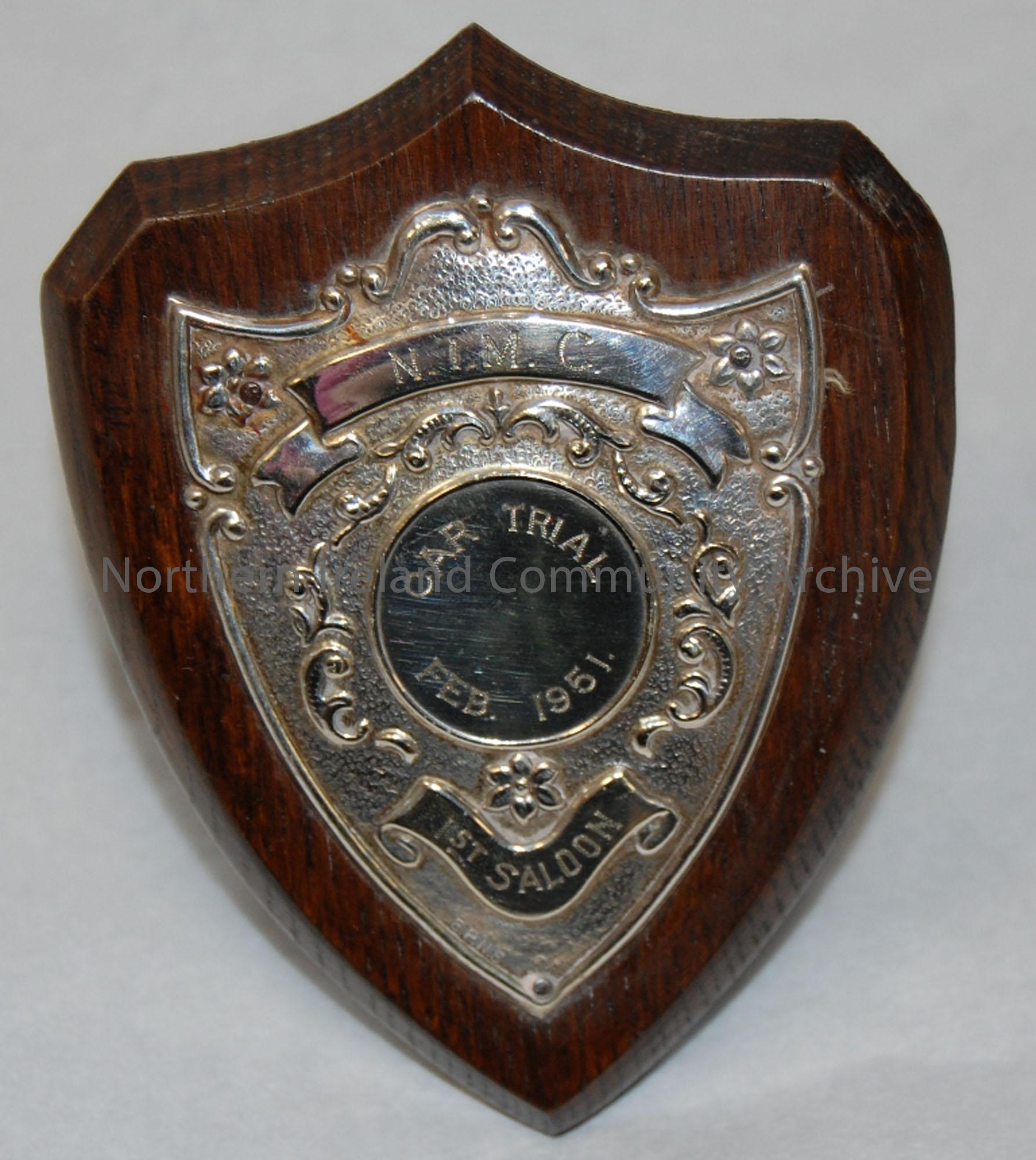 Small plaque with wooden mount, N.I.M.C Car Trial, February 1951, 1st Saloon