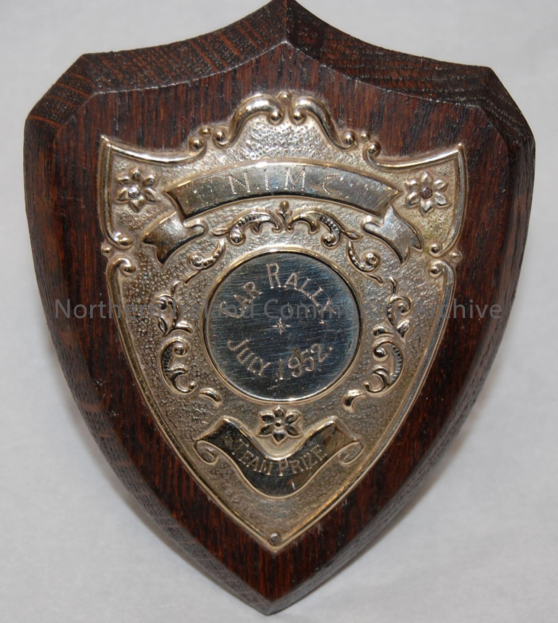 Small plaque with wooden mount. N.I.M.C (North of Ireland Motor Club) Car rally July 1952 Team Prize