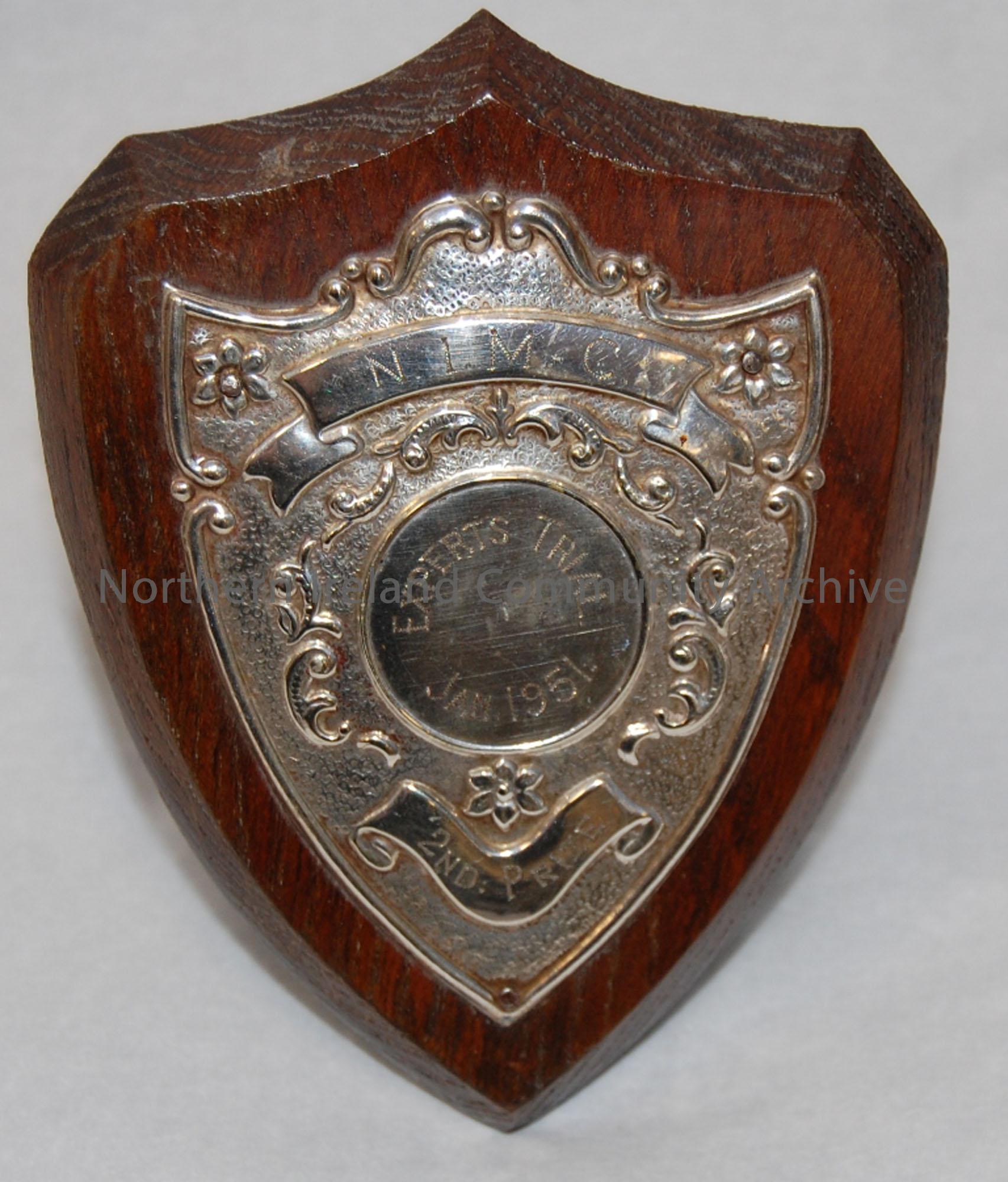 Small plaque with wooden mount. N.I.M.C (North of Ireland Motor Club) Experts Trial, January 1951 2nd Prize