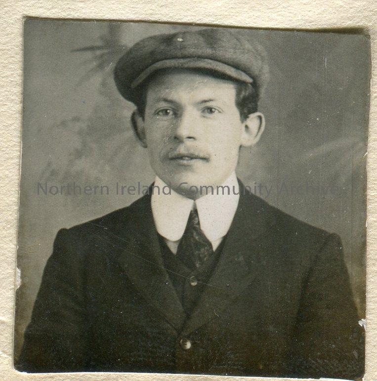 Small portrait photograph of a man wearing a flat cap and suit and tie.
