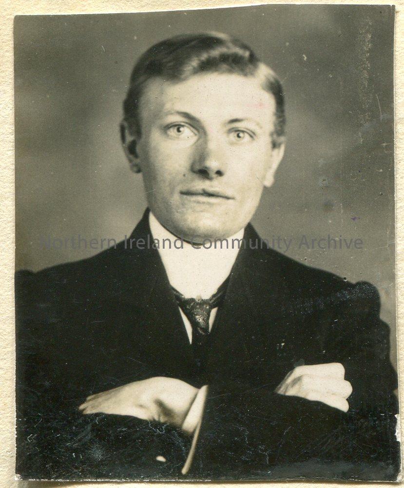 Small portrait photograph of a man with his arms crossed. Part of several photographs pasted to page titled, ‘A portrait gallery of the past’.