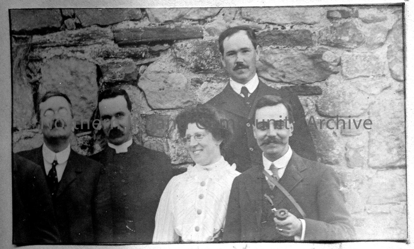Small printed black and white photographic image of 5 people in front of a stone wall . Included in the photograph in Sam Henry (back row). Front row … – scan007b