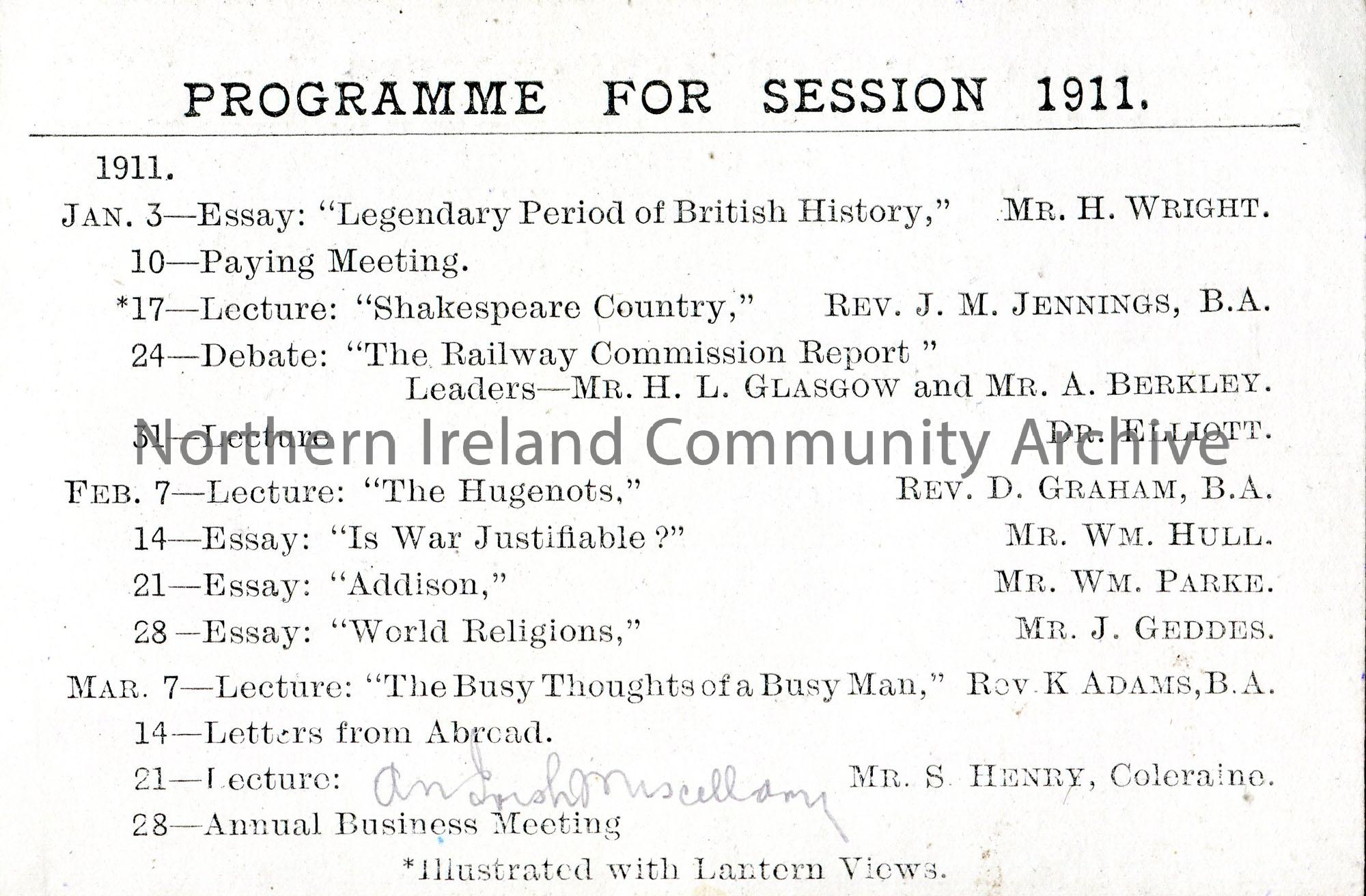 Small programme card for Cookstown Young Men's Christian & Literary Association 1910-1911. Sam Henry is noted in the programme for a lecture on 21st March 1911. He has handwritten the title of the lecture into the programme 'An Irish Miscellany'.