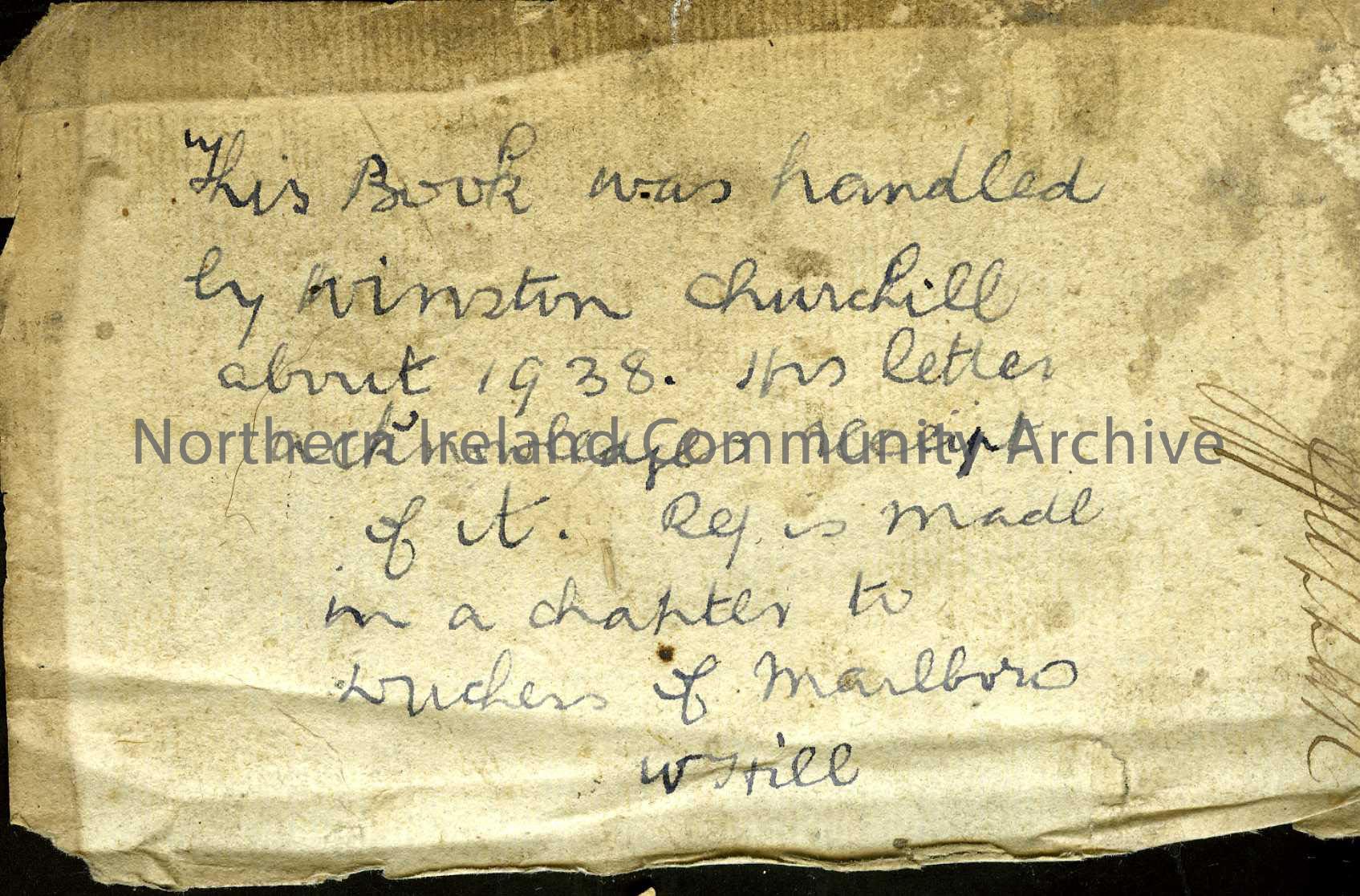 small rectangle of paper, found inside CM:2011:588.1, stating that this book was handled by Winston Churchill around 1938, and signed by a W Hill. CM:…