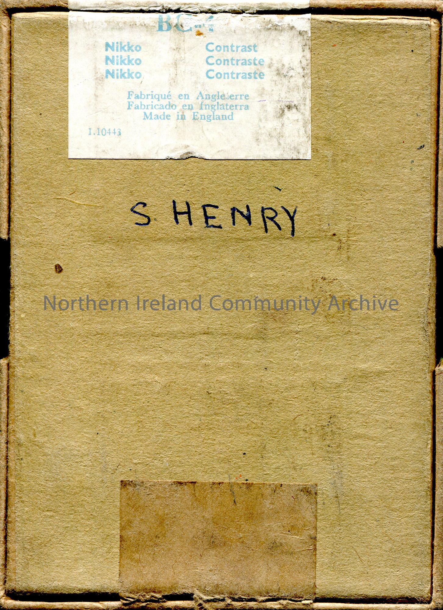 Small, rectangular box with lid for glass lantern slides. ‘Kodak 144 4 1/2 x 3 1/2 inches 9×11.5cm’. Labelled, ‘Card Box 4’. ‘S. HENRY’ handwritten on… – scan036b