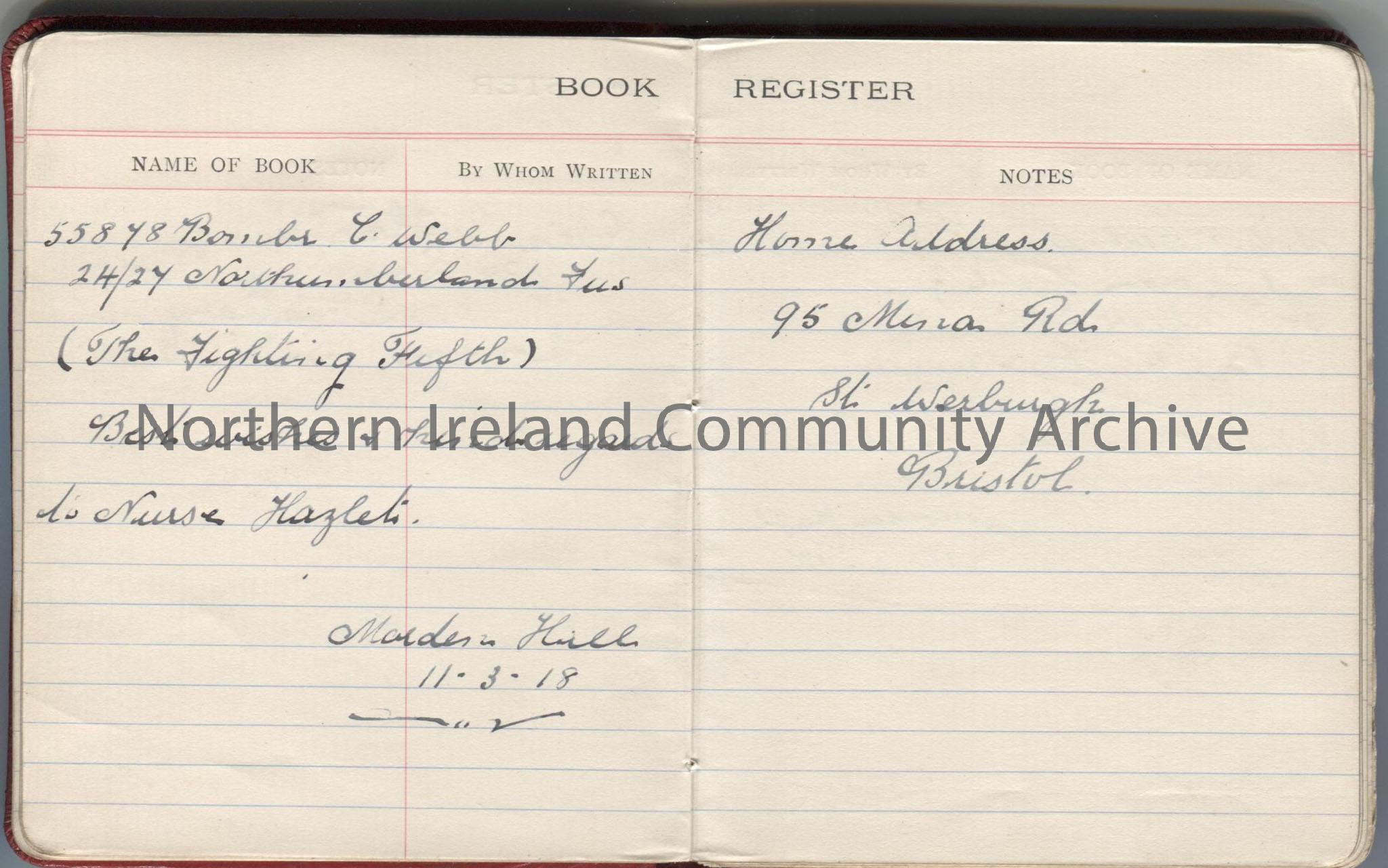 Small red notebook with ‘Book Register’ in gold on front. Inside front cover is written ‘N. Hazlet (Hezlet), best wishes from E. G. Hatcher, Xmas 1917… – 001d