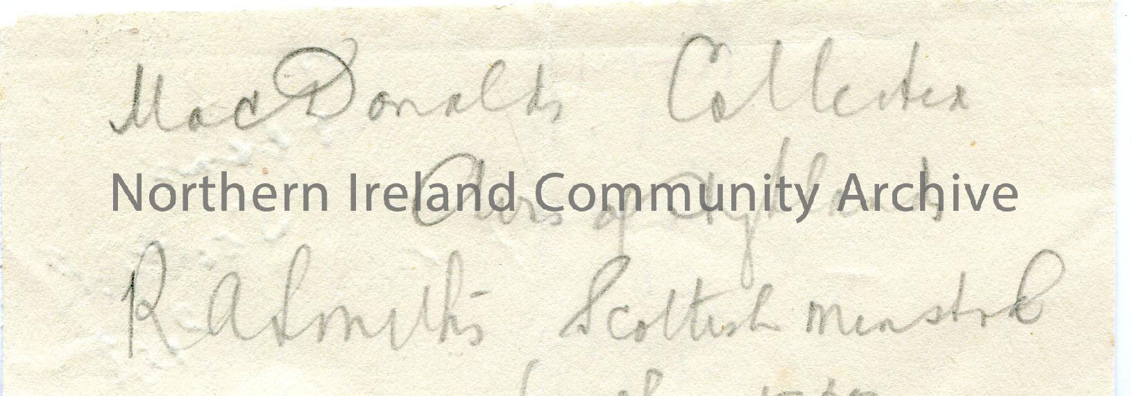 Small rough handwritten note. Appears to have been trimmed, cutting out some of information. – img457