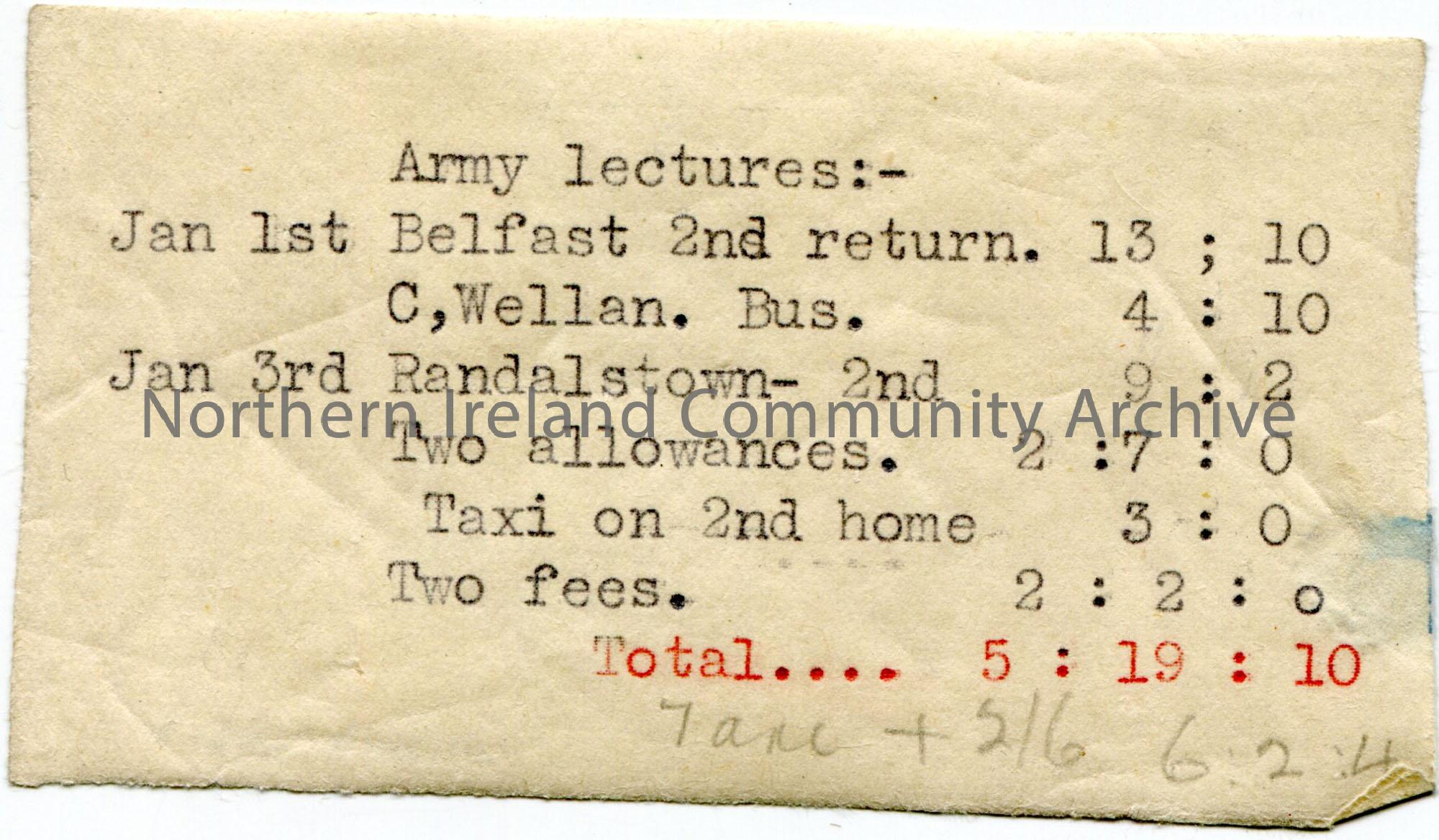 Small slip of paper found in CM:2018:602.1 in between pages 18-19. Typed list of travel expenses for Army Lectures on 1st and 3rd January. Totals 6.2.4.