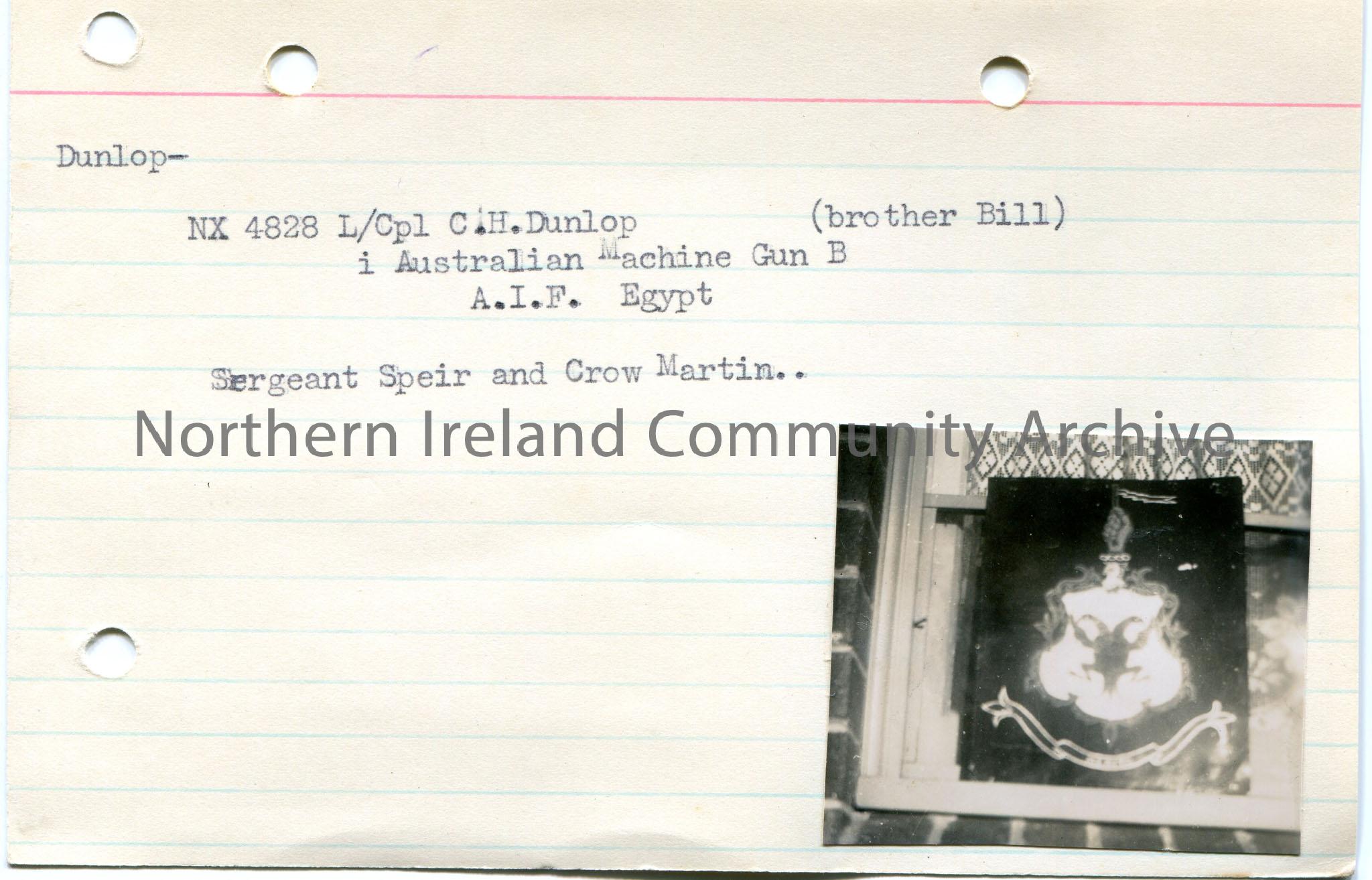 Small square shaped photograph stuck to lined card with notes re Cpl C.H.Dunlop. Photograph possibly shows a coat of arms sitting on a window ledge.
