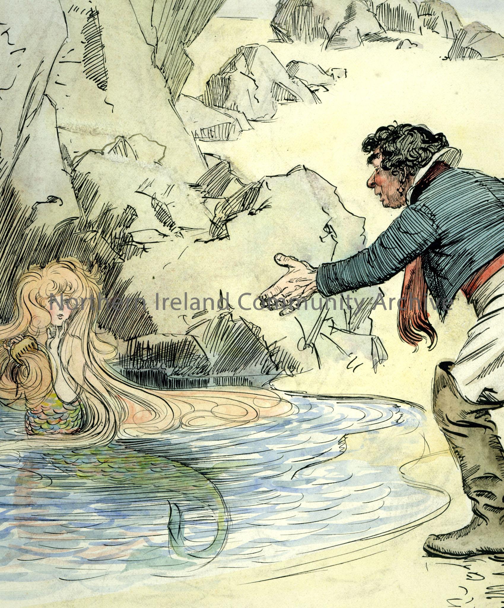 artwork titled, 'So he put on his most wheedling voice' by Hugh Thomson for Highways and Byways in Devon and Cornwall. Signed by Hugh Thomson and dated 97 in left hand corner. It was unusual to supply watercolours for this series. Could possibly be for page 276 in book. Depicts mermaid brushing her hair, male figure, rocks, birds, hat and beach.