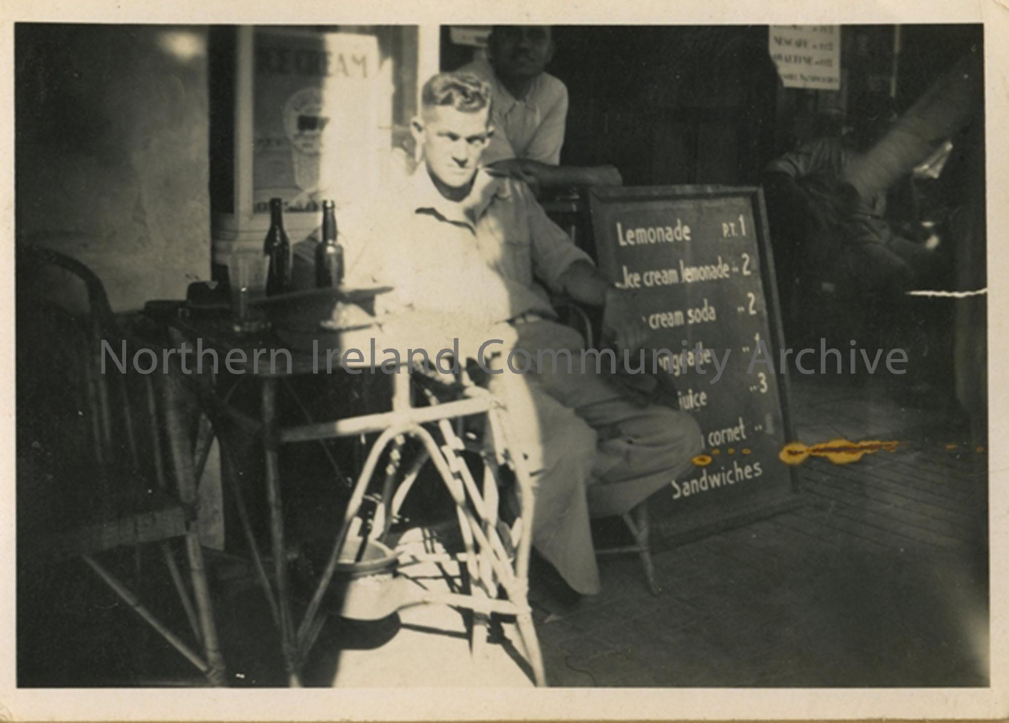 Soldier sitting at a table outside a café. There is a board in the background showing prices of drinks, sandwiches etc.