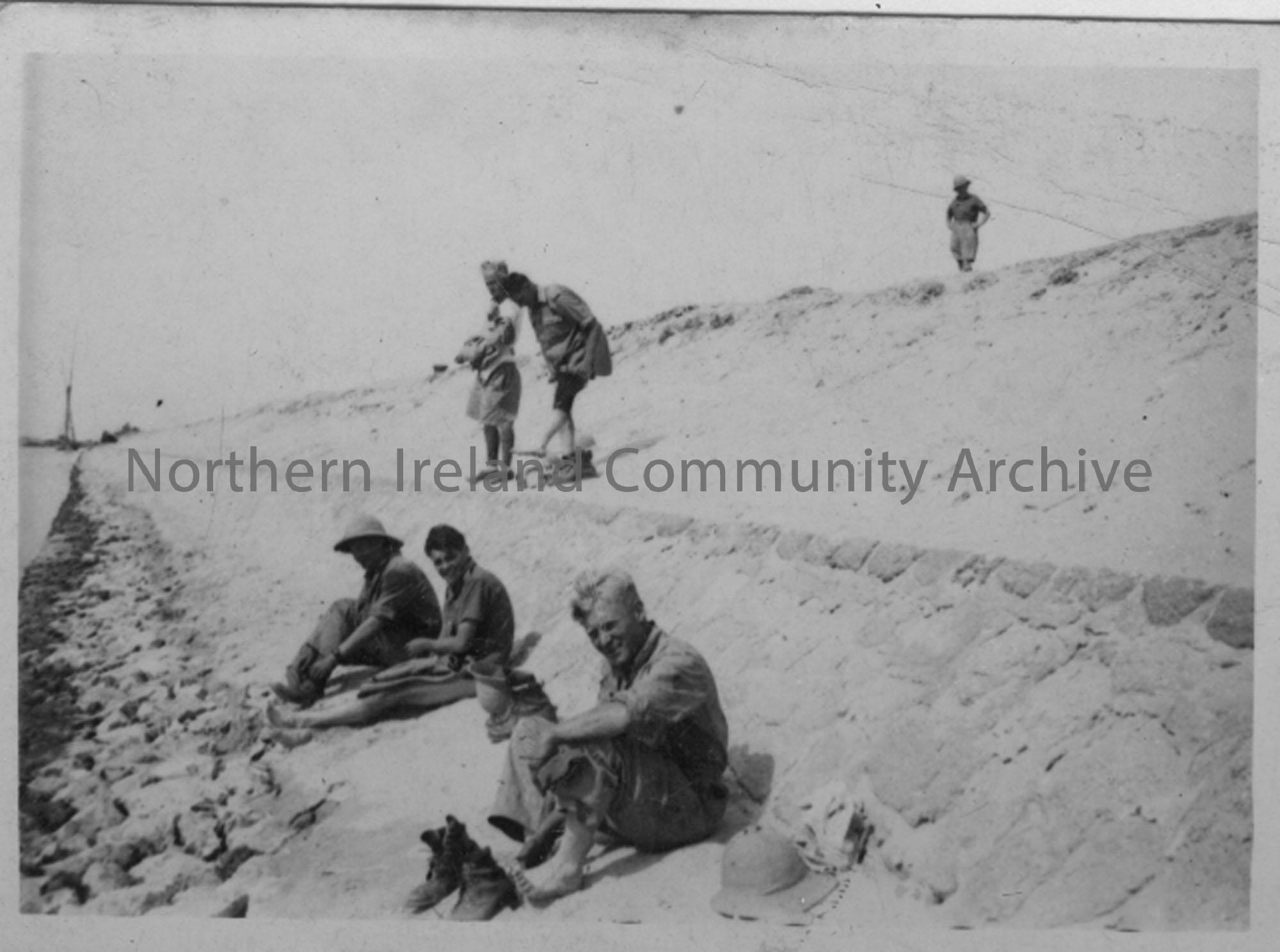 Group of six soldiers sitting on the bank of the Suez Canal.