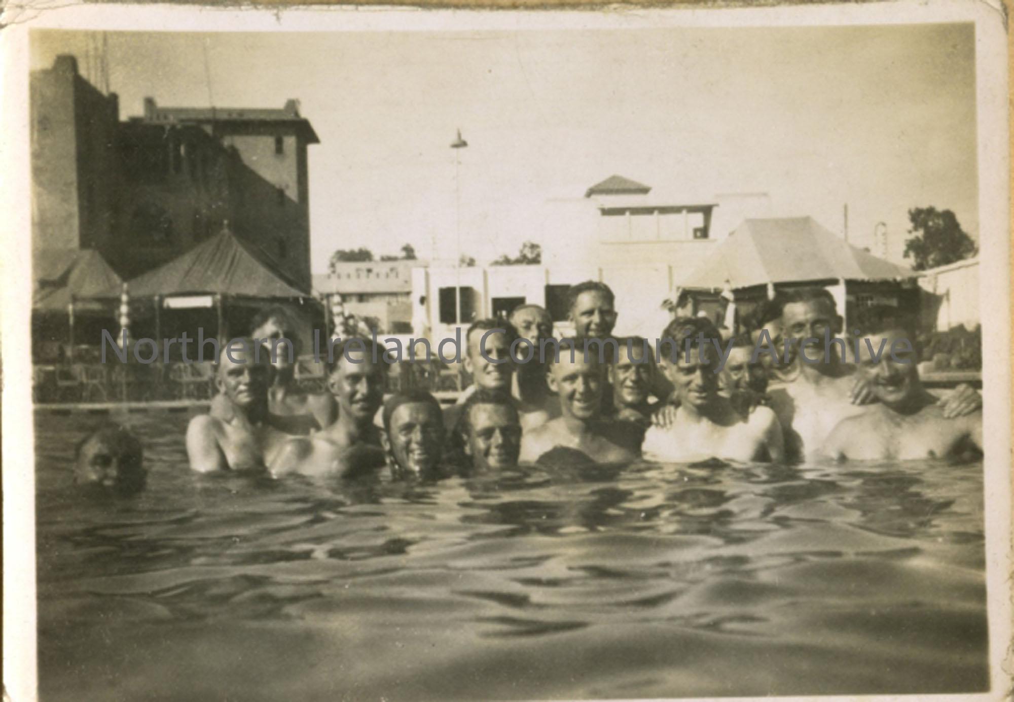 Photo of a group of soldiers in Heliopolis swimming pool, Cairo. BSM Tom McDonald 7th from left.